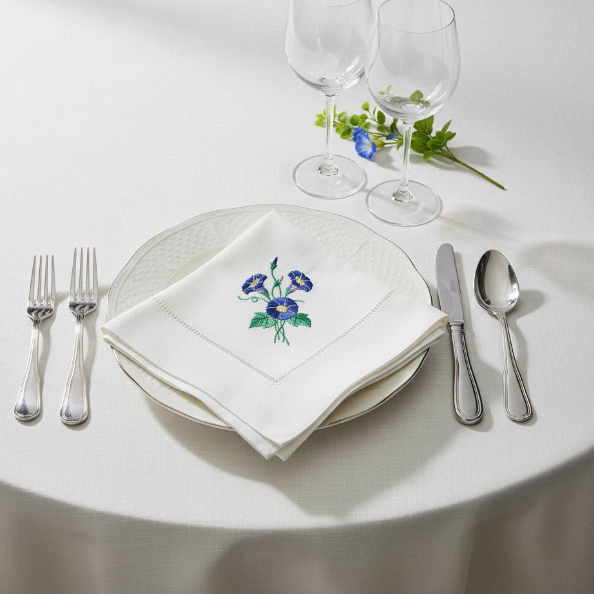 Bring timeless elegance to your table with our embroidered linen dinner napkins, beautifully adorned with a delicate Morning Glory flower design. Each napkin features fine hemstitch detailing and is crafted from a luxurious blend of 55% linen and 45% cotton, offering both beauty and durability.