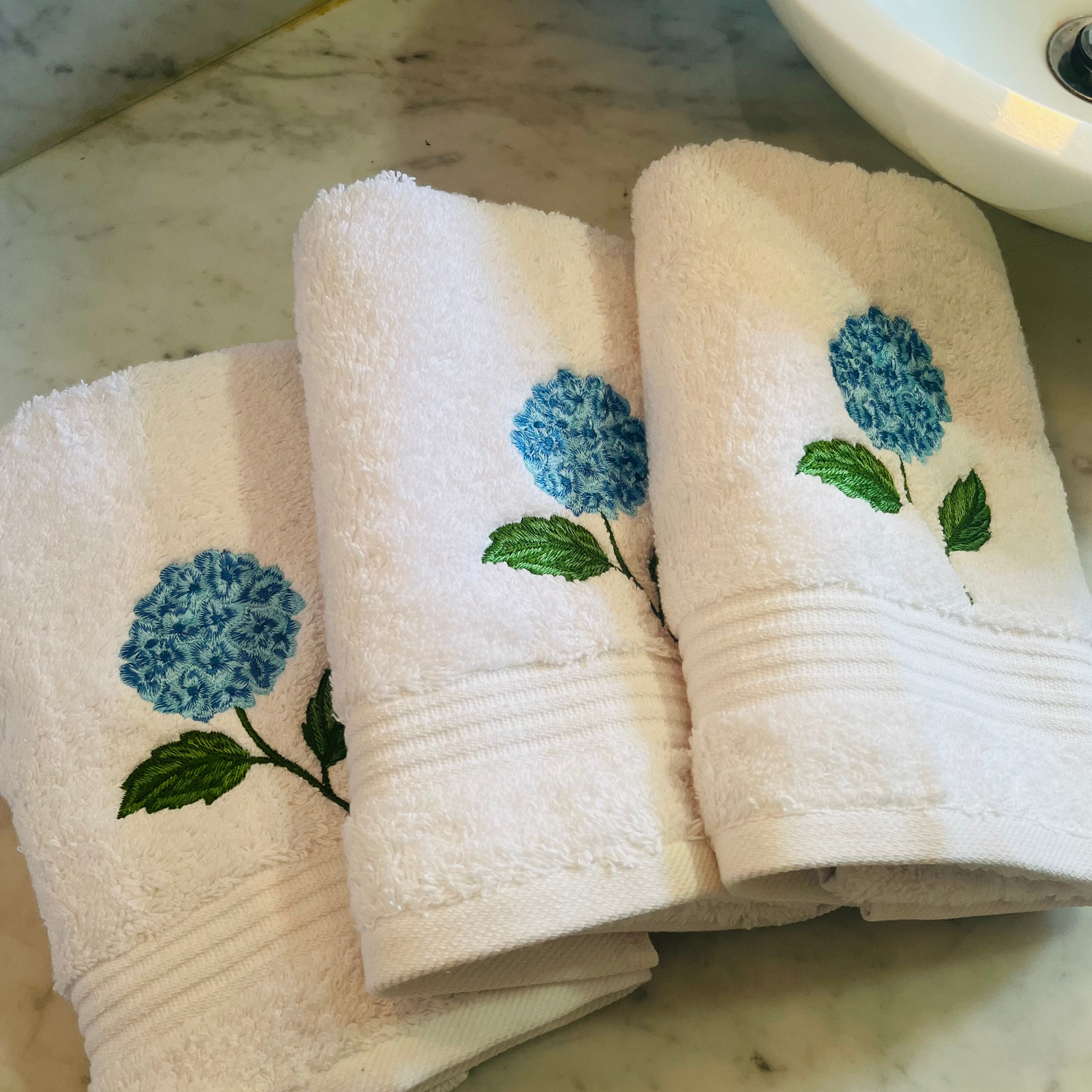 Each towel is embroidered with a delicate hydrangea flower embroidery, adding timeless charm and elegance to your bathroom decor. Perfect for refreshing your space with new bathroom ideas, updating a master bathroom, or adding a refined accent during a bathroom remodel.