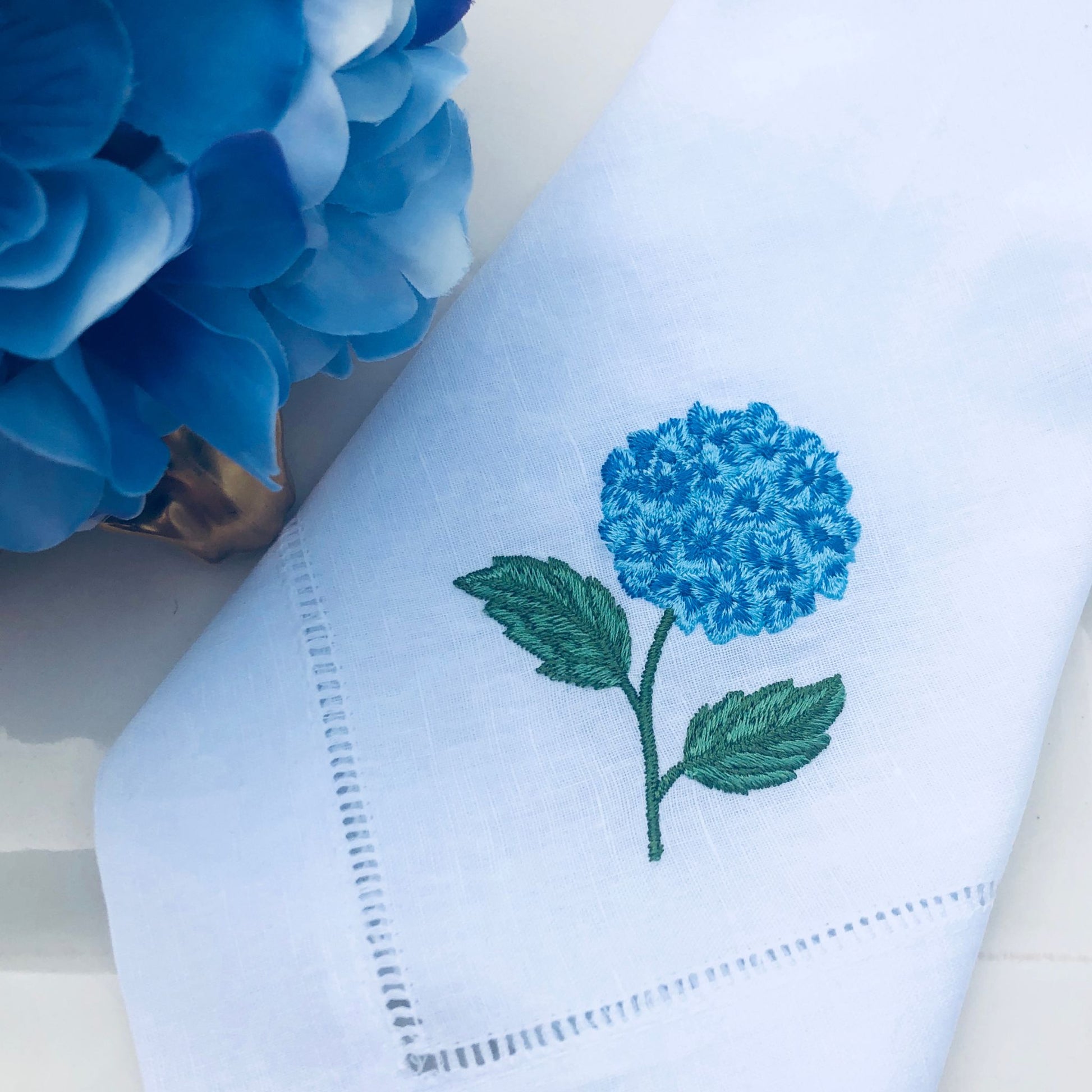 Hydrangea Linen Napkin is an elegant, hemstitched dinner napkin embroidered with a delicate hydrangea motif—perfect for elevating table settings for formal dinners, wedding receptions, or intimate family gatherings.