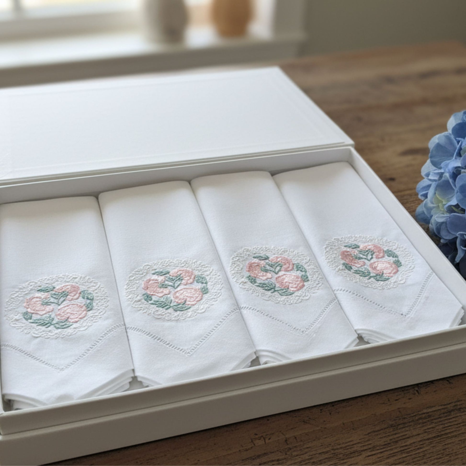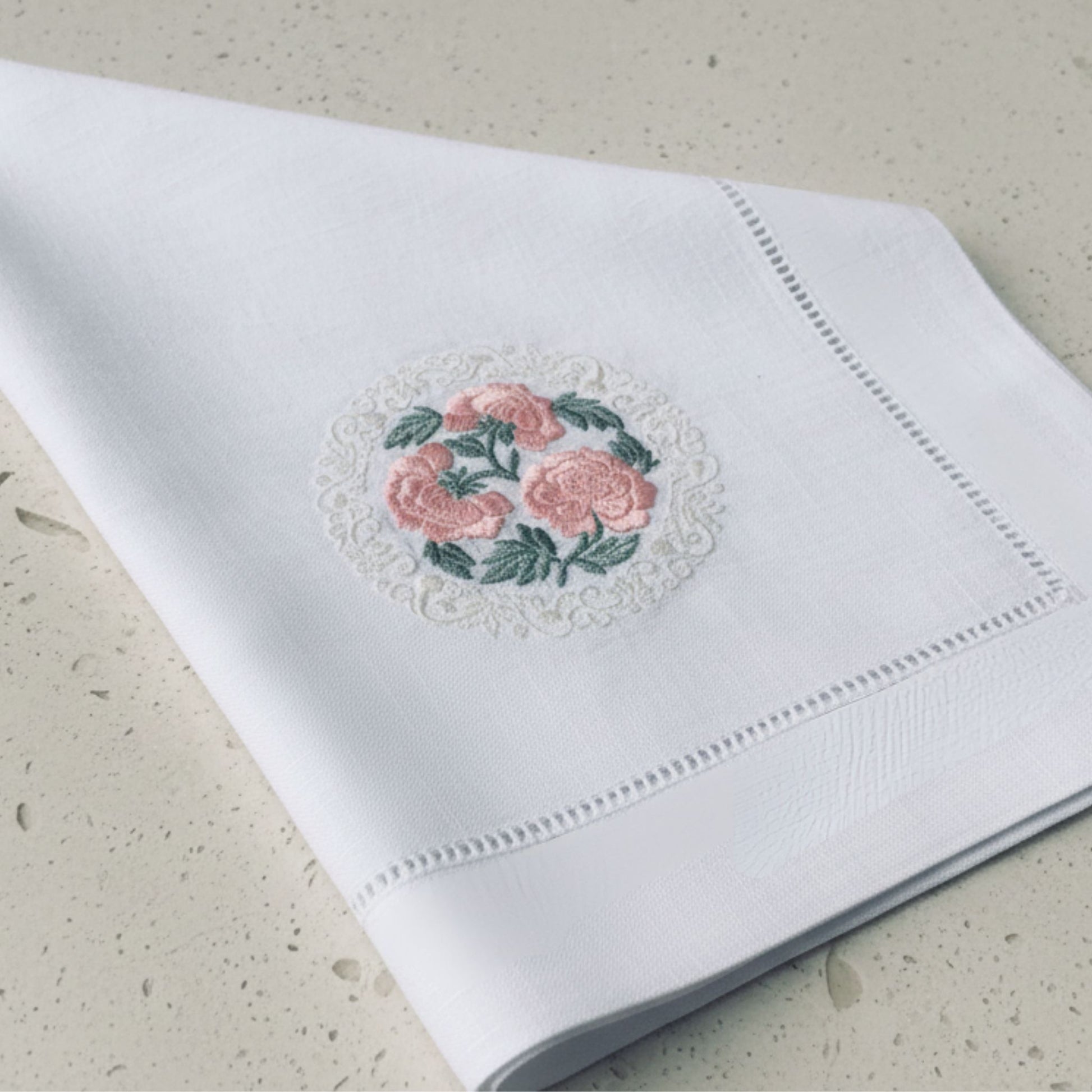 These embroidered peony linen napkins make thoughtful gifts for weddings, housewarmings, Mother’s Day, or any special event. They can also be customized with monograms or personalized designs — just contact me for custom orders!