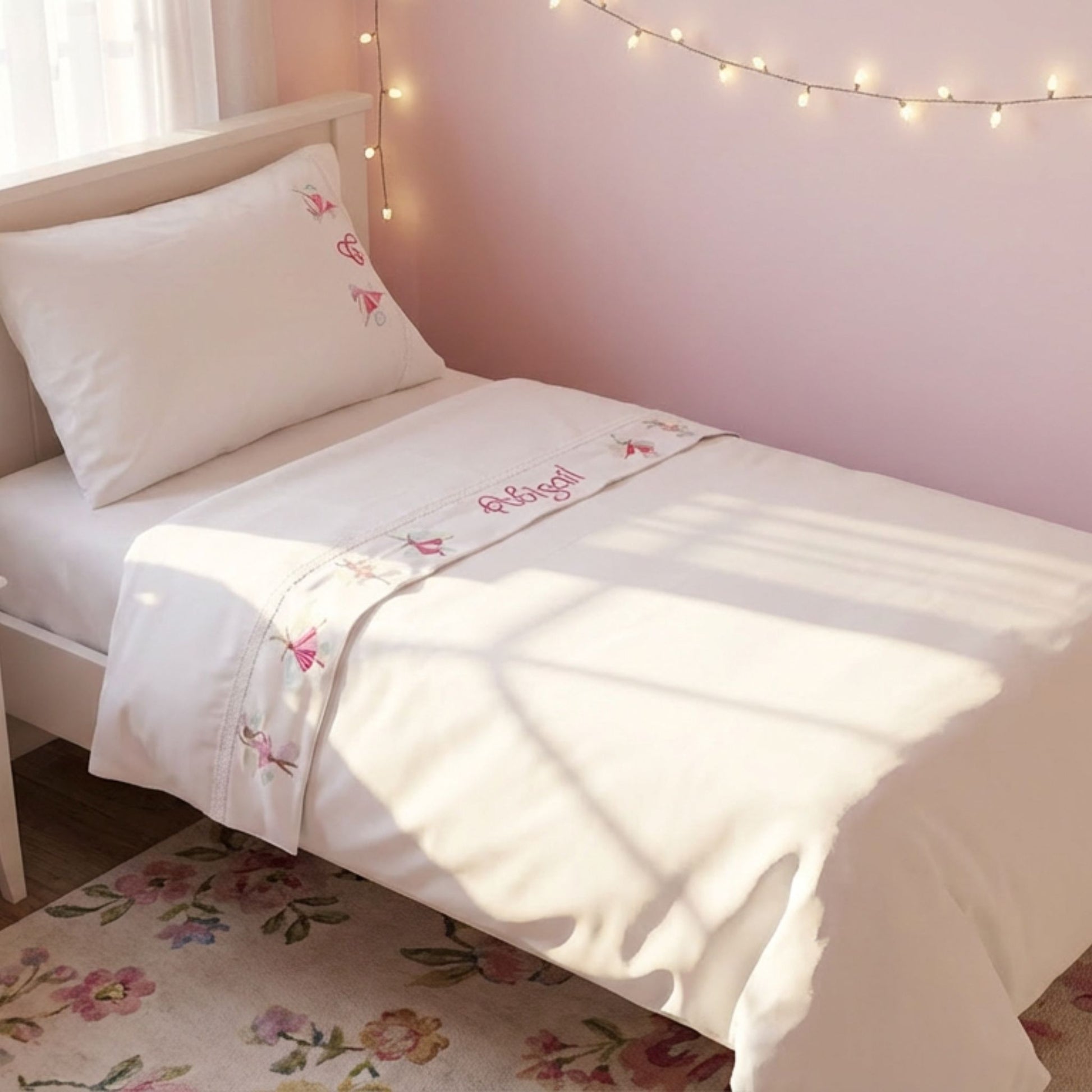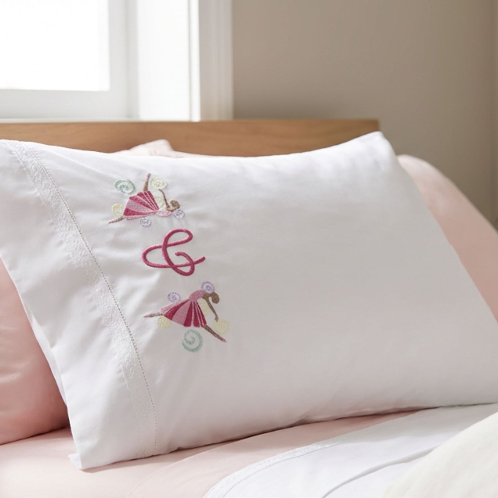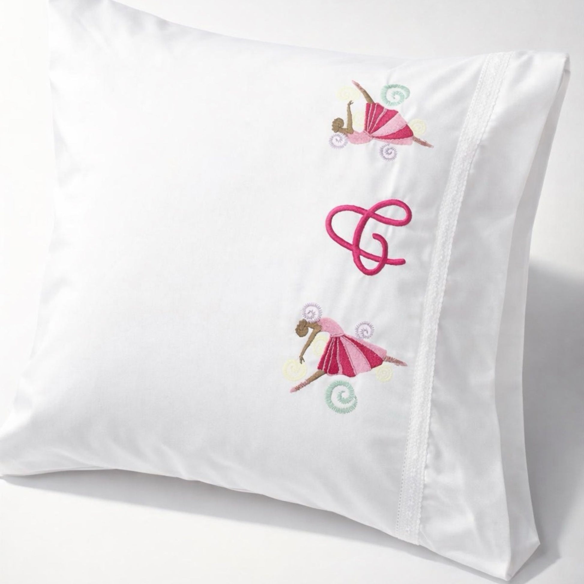 The set is embroidered with dancing ballerinas and finished with delicate cotton lace for a classic, feminine look. Personalization is available—names or initials— with initials restricted to pillowcases. The set ships packaged in a gift box, ready for gifting.