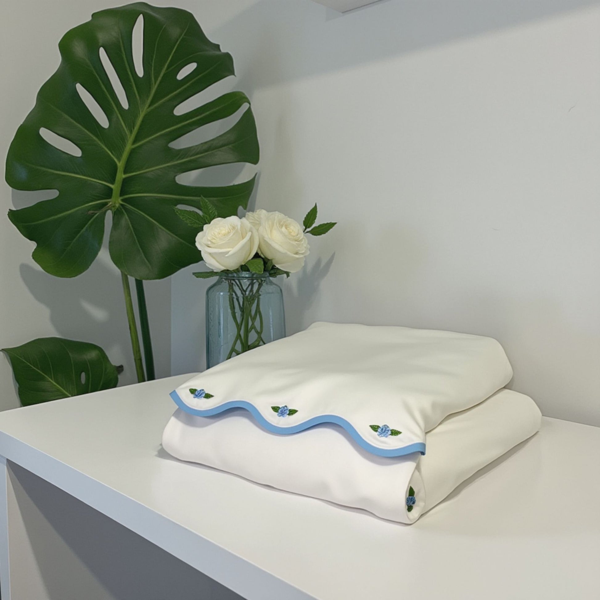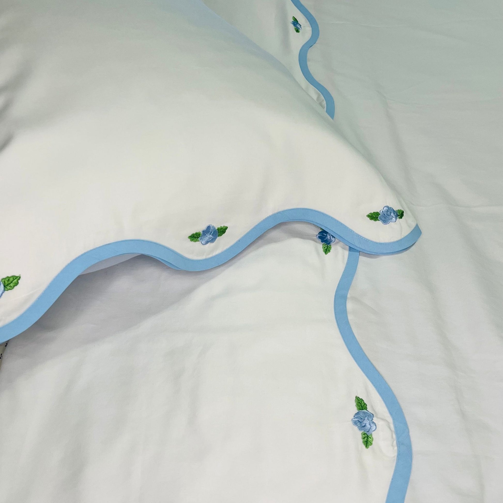 Delicate roses are embroidered along the sheet and pillowcases, beautifully framed by a scalloped edge trimmed in your choice of blue or pink. Whether you prefer the calming touch of blue or the romantic charm of pink, this set adds a graceful, vintage-inspired finish to any bedroom.